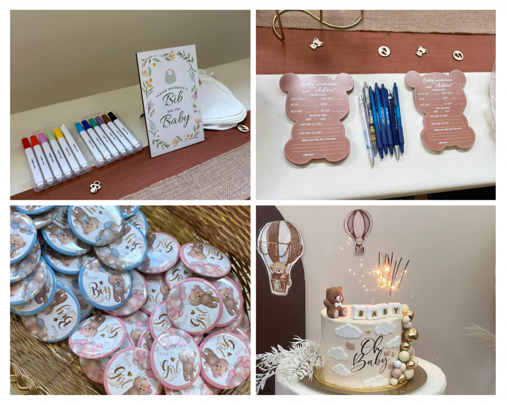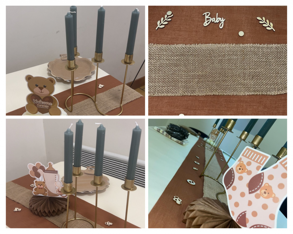 Entre Shein, Temu et Aliexpress, j’ai déniché des merveilles : des ballons, des cubes BABY, des oursons géants (un crème et un brun, trop mignons), des accessoires à croquer — serviettes ourson, présentoir gâteau ourson, boîte à pop-corn et boîte à bonbons ourson, lettres géantes BABY, centres de table ourson, pics pour fruits ourson…